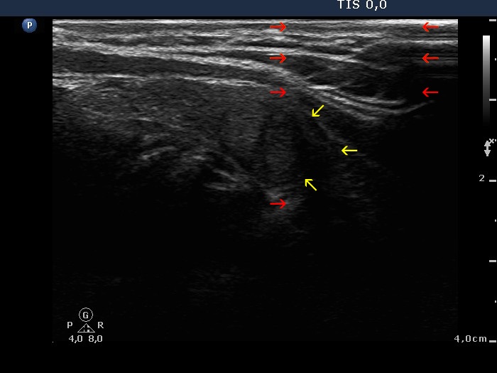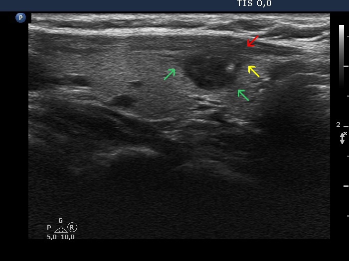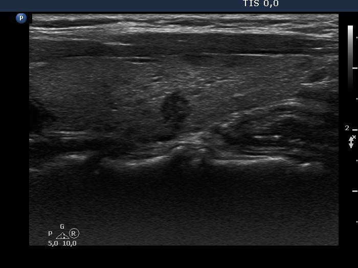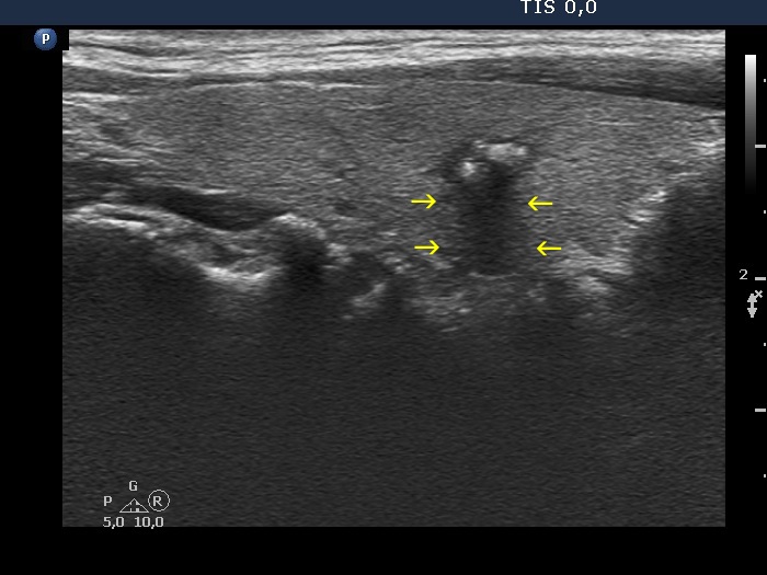 The region of the dorsal border between the two arrows is suspicious being blurred. On the other hand, the echogenicity of the nodule and the extranodular parenchyma are very similar, therefore it is equivocal whether the area in question should be held abnormal. |