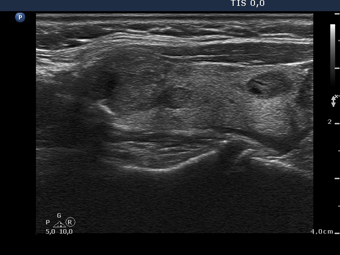 A combined ultrasound-cytological diagnosis was given in the case of the left nodule: benign follicular proliferation with less than 1% risk of carcinoma.
