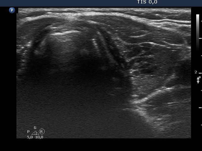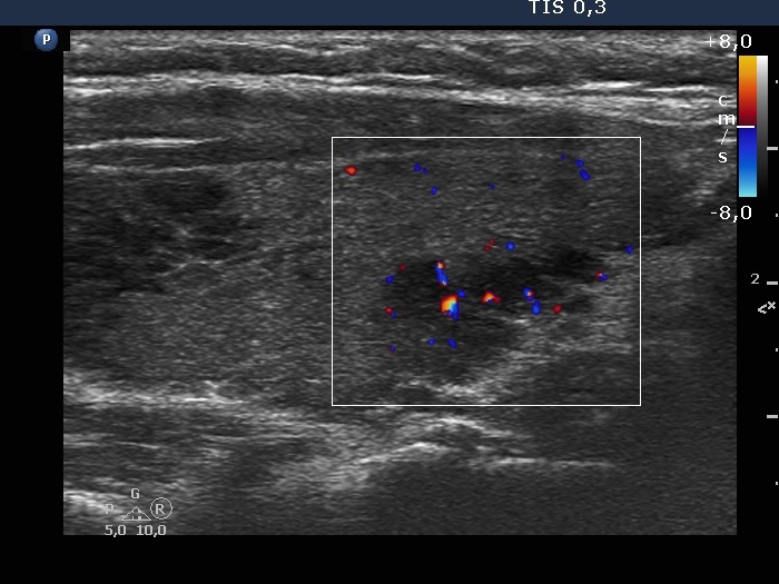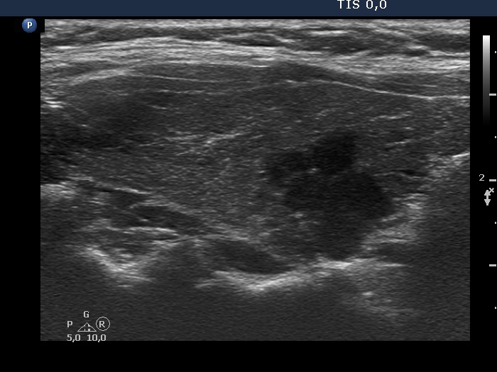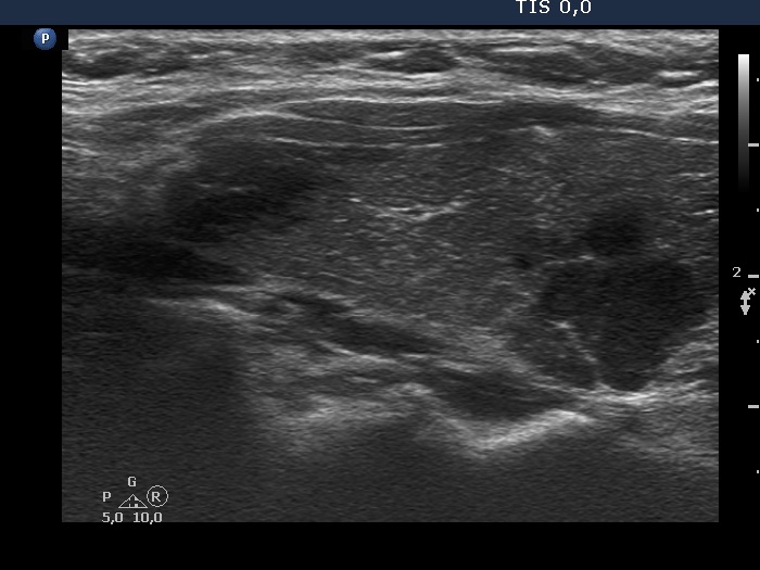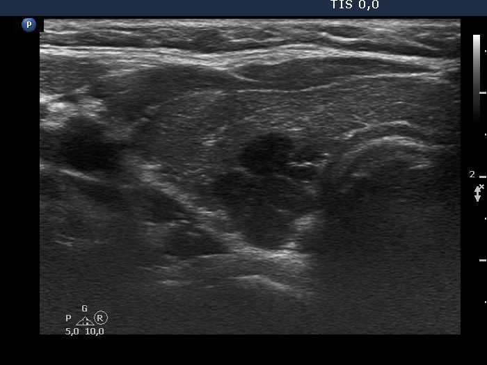 Clinical presentation: A 39-yr-old woman was referred for evaluation of a nodule described as highly suspicious because of the presence of irregular, partly lobulated, partly spiculated margins and that of microcalcifications. The patient requested the investigation because of complaints suggesting hypothyroidism.