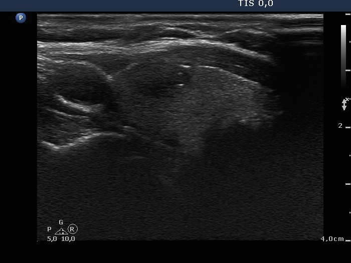 Ultrasonography. There was a hypoechogenic nodule with cotton-like hyperechogenic patches and smaller punctate hyperechogenic granules in the right lobe. The nodule presented intranodular blood flow and lobulated margins.