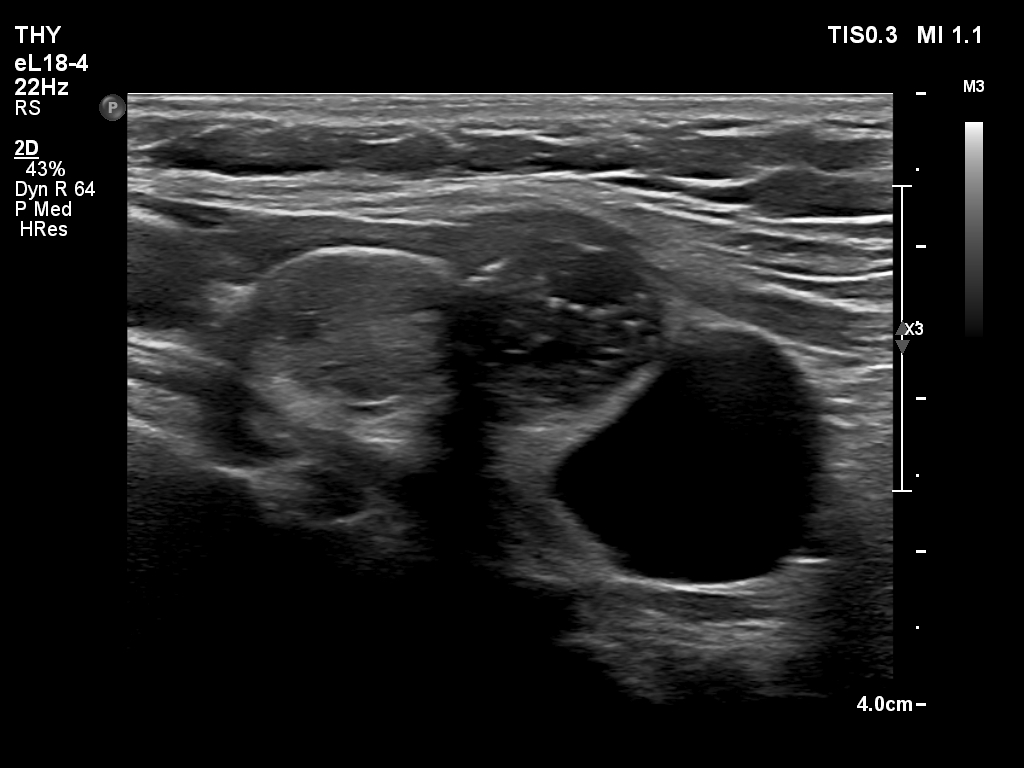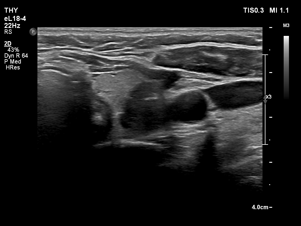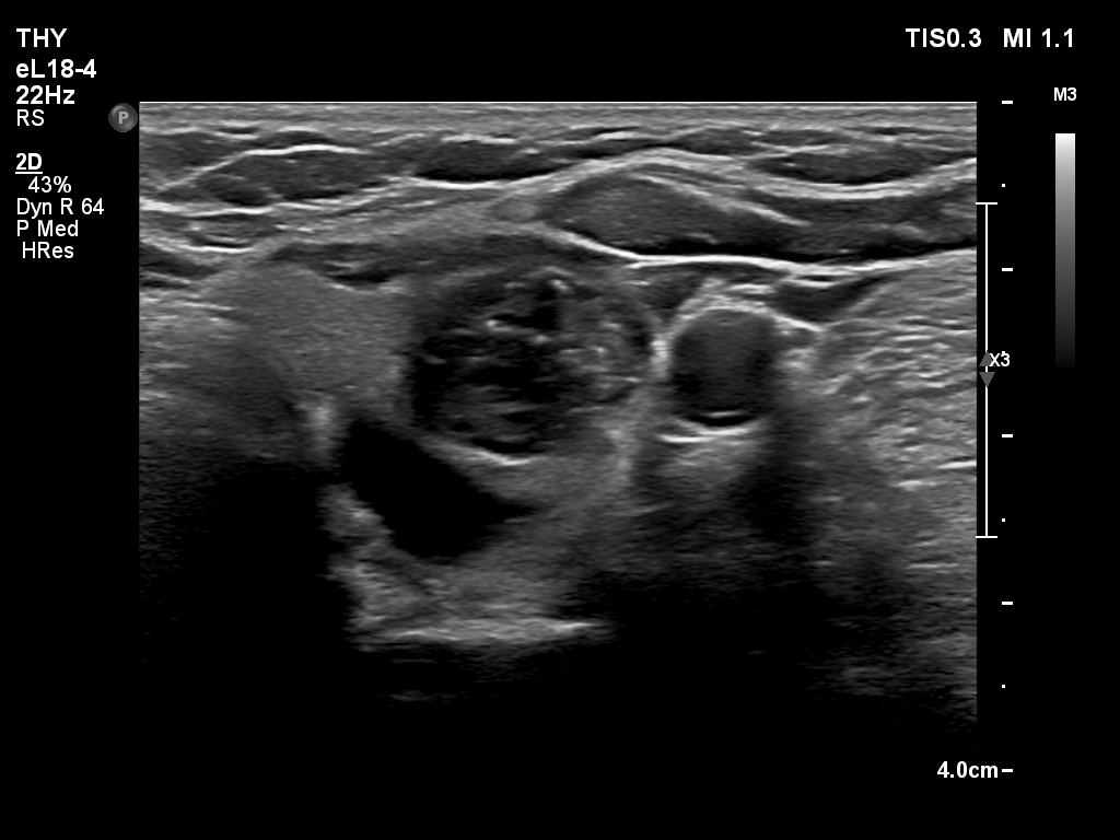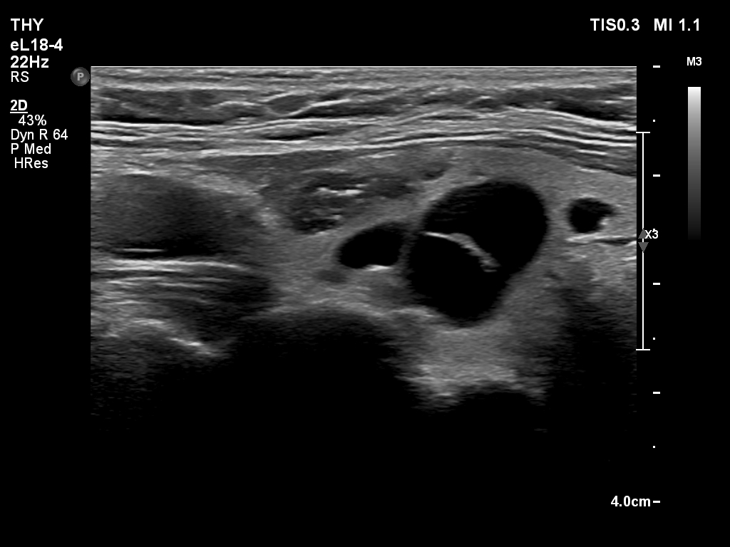 Ultrasonography. The thyroid was echonormal and had multiple nodules. There were cystic areas, an almost completely cystic nodule, and a dominantly solid nodule in the right lobe. The left lobe had three lesions. The upper solid lesion was the one we treated 16 years ago. The middle lesion was a dominantly solid while the lower one seemed to be a pure cyst. The dimensions of the nodule which has been treated with sclerotherapy were 10x11x13 mm (width, depth and length, respectively). There was a large cystic nodule in the upper pole of the left lobe. The lesion showed relatively large hyperechogenic granules. There were multiple enlarged lymph nodes lateral to the left lobe, two of largest were cystic.