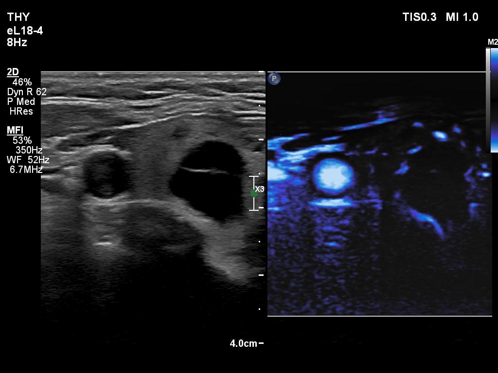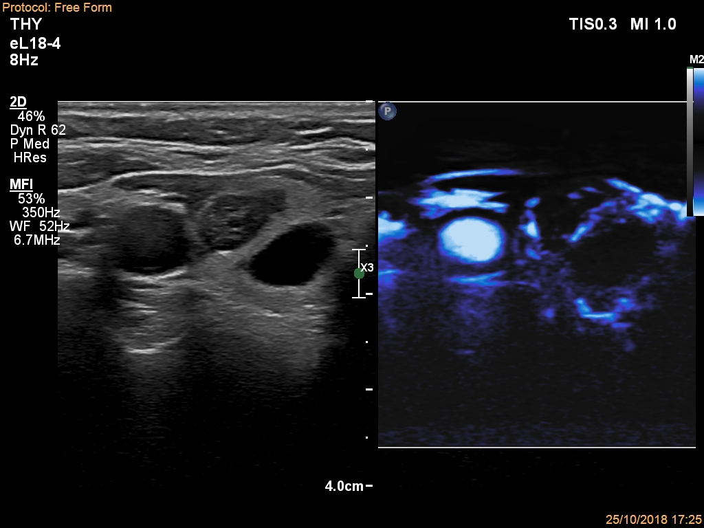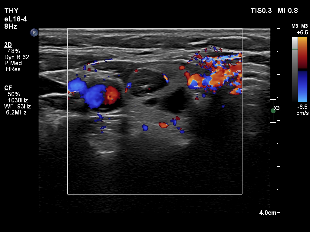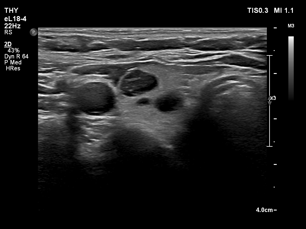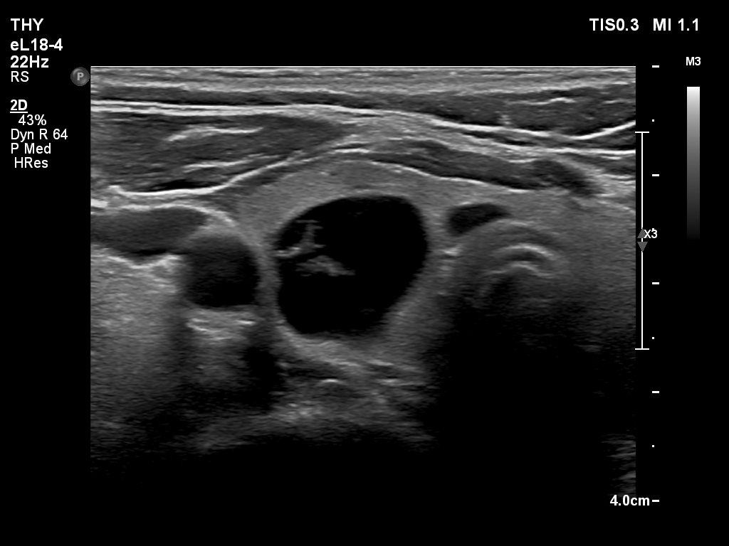 Ultrasonography. The thyroid was echonormal and had multiple nodules. There were cystic areas, an almost completely cystic nodule, and a dominantly solid nodule in the right lobe. The left lobe had three lesions. The upper solid lesion was the one we treated 16 years ago. The middle lesion was a dominantly solid while the lower one seemed to be a pure cyst. The dimensions of the nodule which has been treated with sclerotherapy were 10x11x13 mm (width, depth and length, respectively). There was a large cystic nodule in the upper pole of the left lobe. The lesion showed relatively large hyperechogenic granules. There were multiple enlarged lymph nodes lateral to the left lobe, two of largest were cystic.
