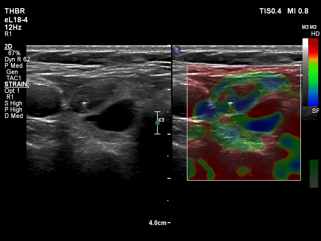 Clinical presentation: A 73-year-old woman came to a follow-up examination. She has been treated for autonomously functioning adenoma with ethanol sclerotherapy for 16 years. The adenoma was located in the upper pole of the left lobe and its dimensions were 18x15x25 mm (width, depth and length, respectively) before the sclerotherapy. The clinical hyperthyroidism had been resolved and the thyrostatic therapy had been discontinued just after the sclerotherapy. In the upcoming 10 years she remained euthyroid. The recent examination was initiated because of ventricular tachycardia.