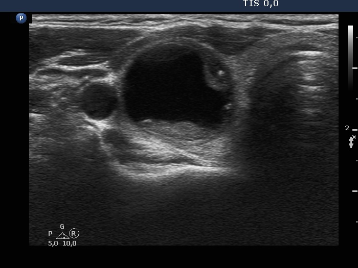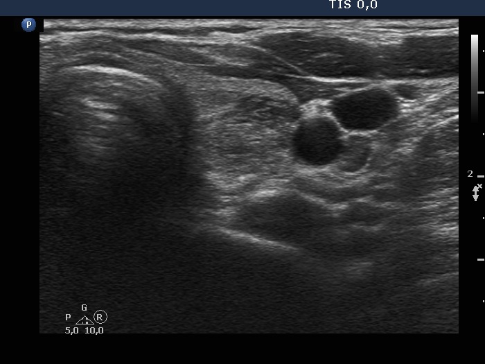 Clinical presentation: A 47-yr-old woman was referred for aspiration cytology. She noticed a lump in her right thyroid lobe four month ago. Three mL cystic fluid was aspirated in another hospital. FNA resulted in benign cystic lesion. The cyst has relapsed within a few weeks. Among others, calcitonin test was performed and yielded twice an elevated levels (21.2 and 28.9 pg/mL - normal value below 11 pg/mL).