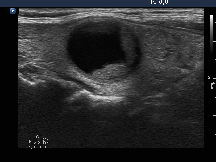 Palpation: an elastic nodule in the right lobe.