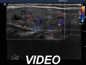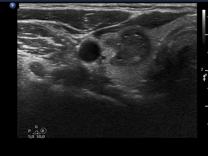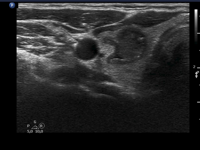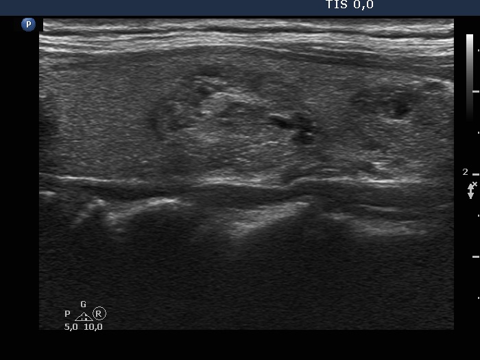 Ultrasonography. The thyroid was echonormal and had multiple moderately hypoechoic and hyperechoic nodules which showed various degrees of cystic degeneration. The largest nodule in the right lobe was dominantly cystic and presented with minimally hypoechoic solid part which included hyperechoic figures. The largest nodule in the left lobe had irregular margins.