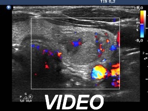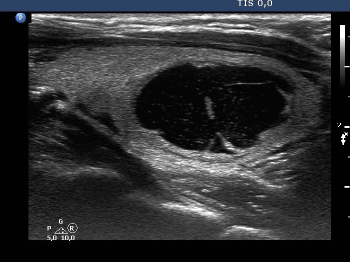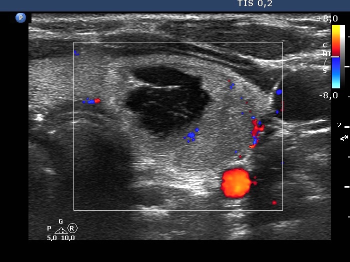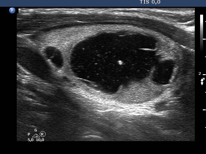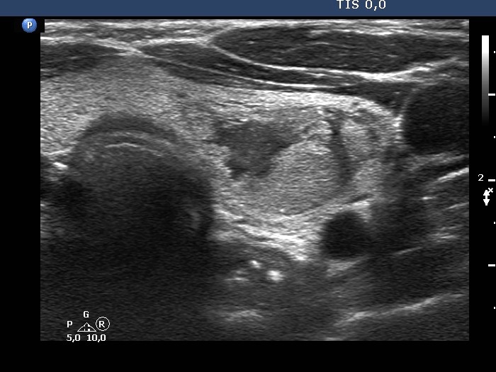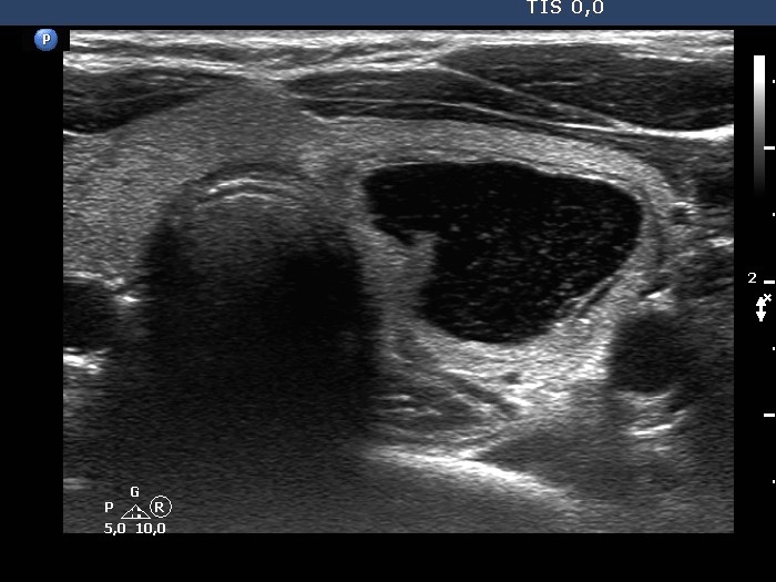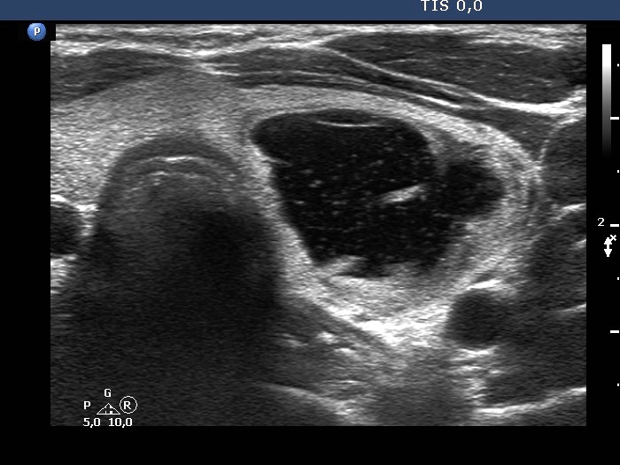 Ultrasonography. The cystic nodule had refilled. The presentation remained the same.Seven mL brown fluid was aspirated. Cytology: benign, cystic lesion.