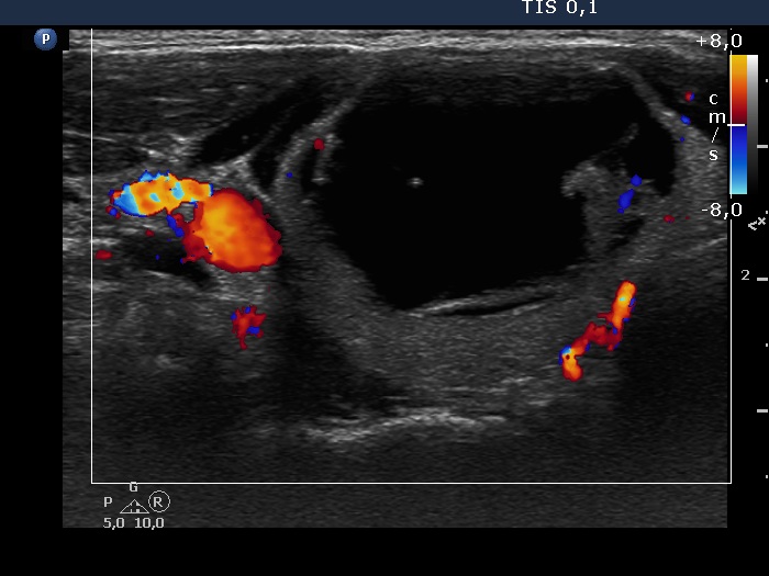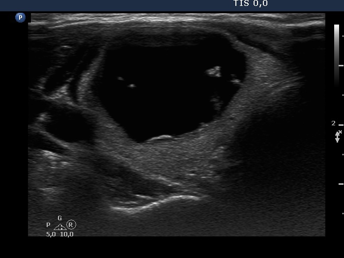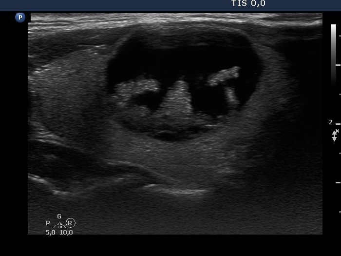 Ultrasonography. The thyroid was echonormal. The right lobe had a cystic nodule with echonormal solid components. The subtype of the cyst is difficult to define, this is probably a peripheral-type cyst.