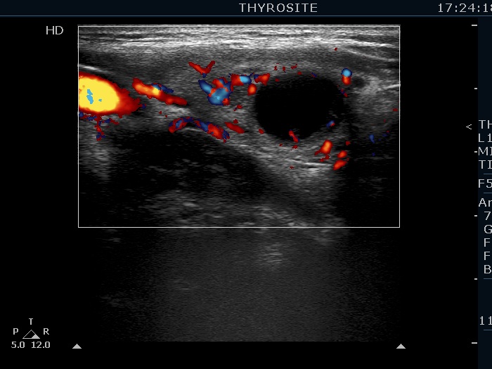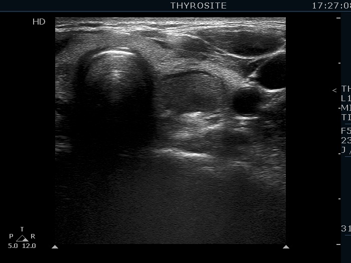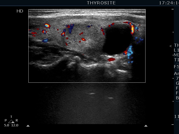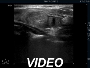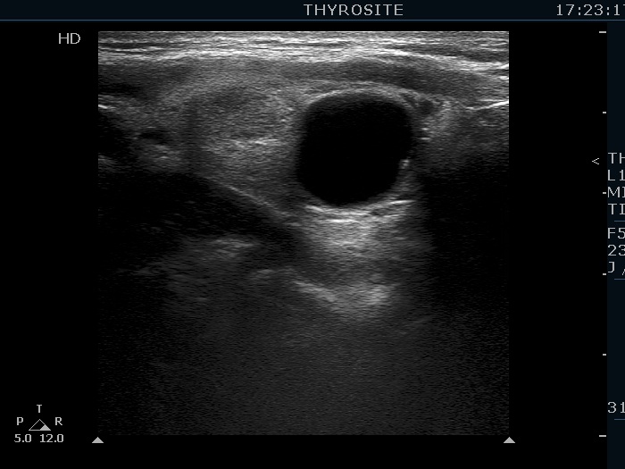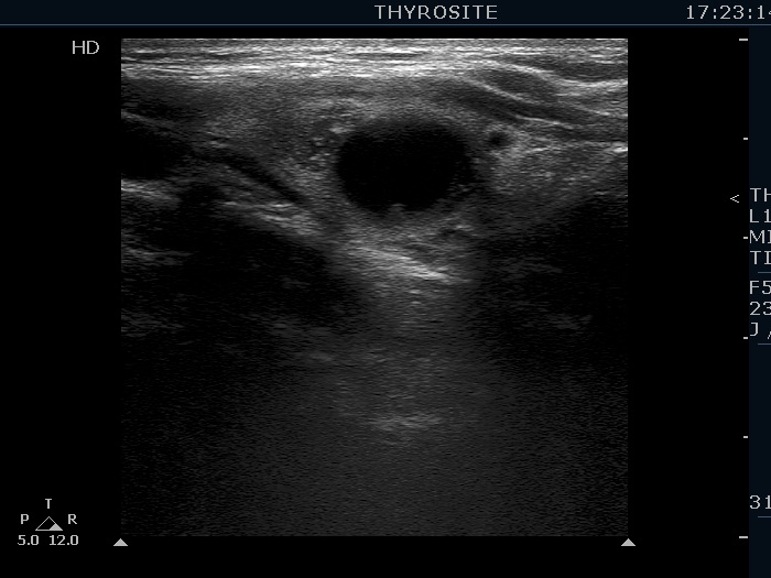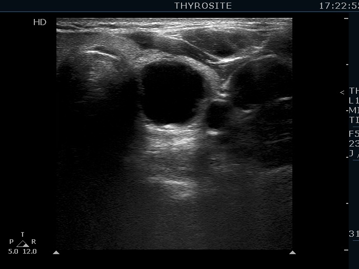 Ultrasonography. The thyroid was echonormal. There were several hypoechogenic lesions in the right lobe. The left lobe had an upper, solid and a lower cystic nodule. The former had both echonormal and moderately hypoechogenic parts and presented halo sign. The cystic nodule had a very tiny solid area in the dorsal part. Nonetheless, before aspiration it was unclear whether this would be a pure cyst or not. After aspirating 2 mL serous fluid a large, moderately hypoechogenic solid area replaced the previous cystic field and it became evident that this is in fact a central type cystic nodule.