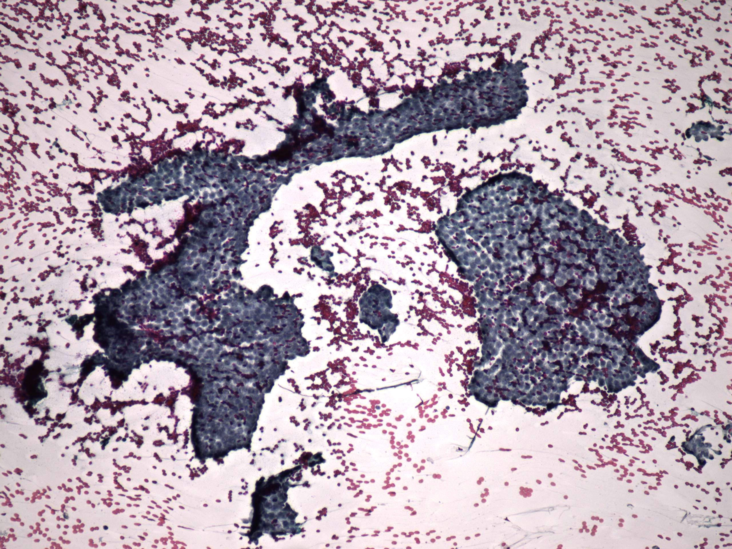 Pap-smear, 100x. A papillary growth pattern is demonstrated.