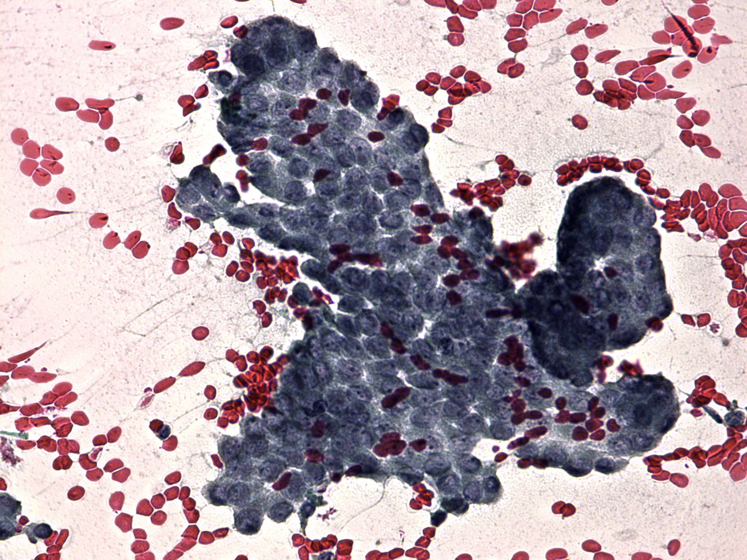Pap-smear, 400x. Nuclei contain small prominent nucleoli. Typical edges of papillary clusters with smooth and sharp surface can be seen.
