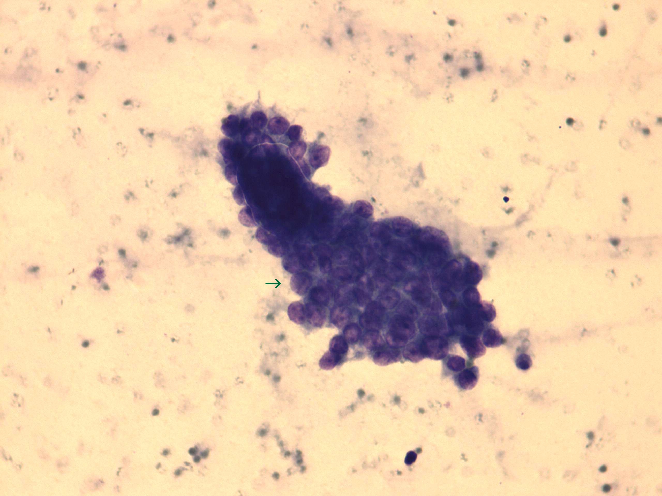 Wright-Giemsa staining, 400x. The nuclei contain prominent nucleoli. One of the nuclei pointed with a green arrow has a groove.