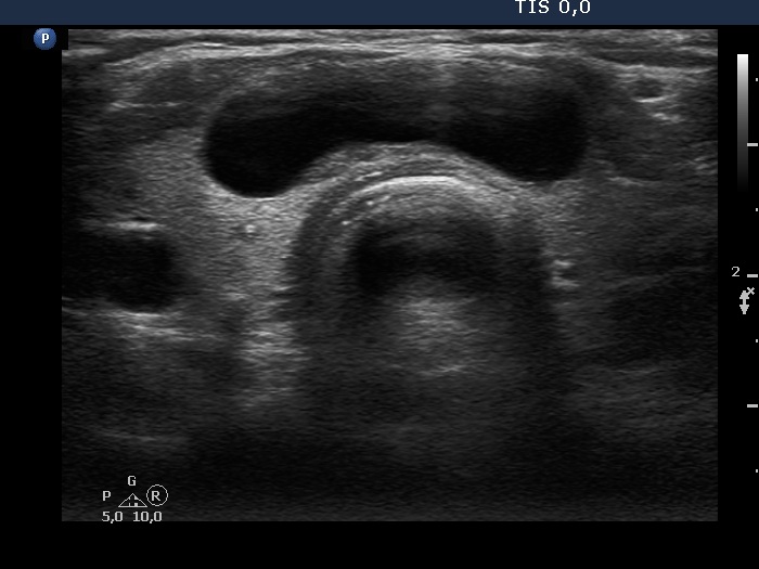 Isthmus, transverse view. There is a dominantly cystic nodule.