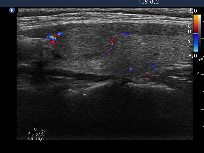Left lobe, longitudinal view, color Doppler mode. The nodule presents signs of perinodular blood flow.