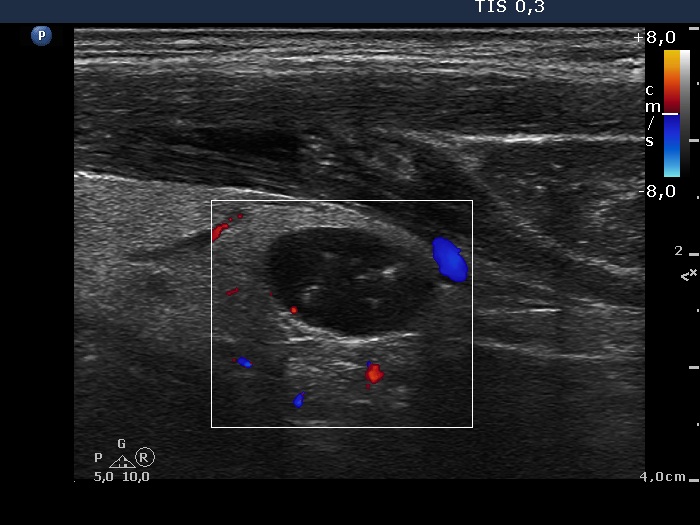 Right lobe, longitudinal view, color Doppler mode. The nodule shows no vascularization.