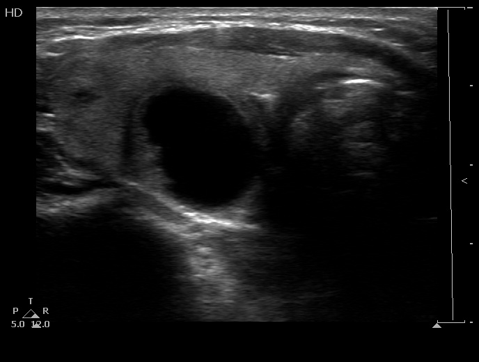 Lower part of the right lobe, another trasnverse view. There is a small solid area in the lateral part of the nodule.