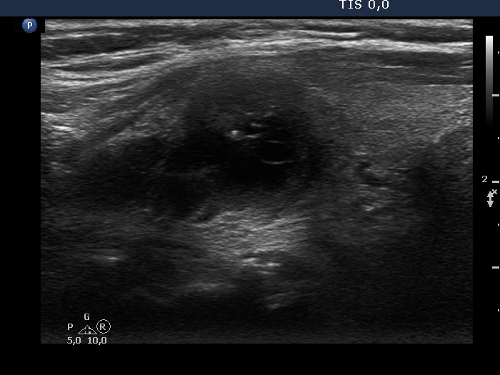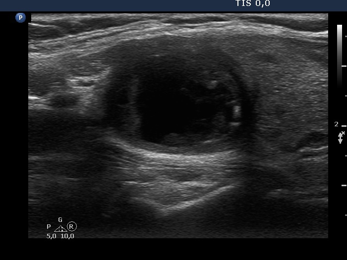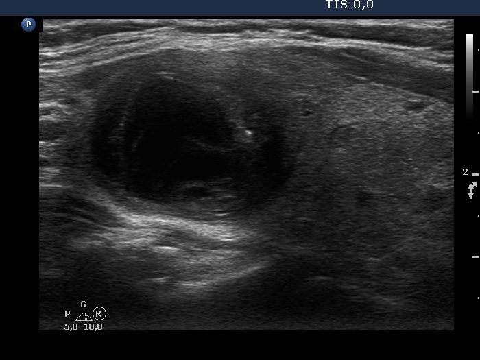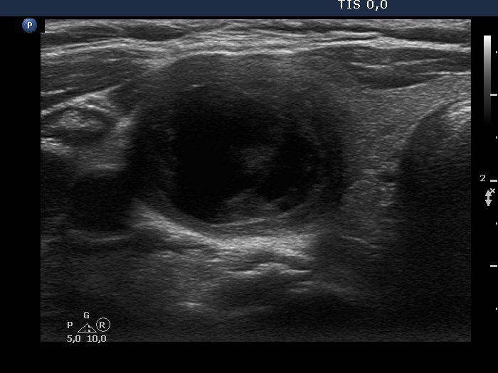 Clinical presentation: A 55-year-old woman has noticed a suddenly developed lump in her right lobe for 3 weeks. She was known harboring a cystic nodule for 3 years when 2.5 mL cystic fluid was aspirated.