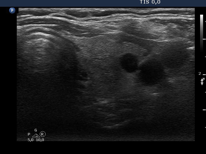 Left lobe, trasnverse scan. This lobe is also echonormal and contains a cystic lesion in this section.