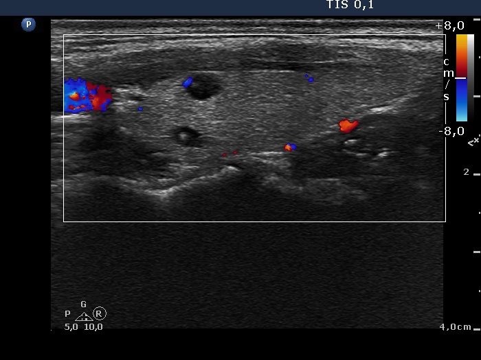 Left lobe, longitudinal scan, color Doppler mode. The vascularization has no relevance in such cases.