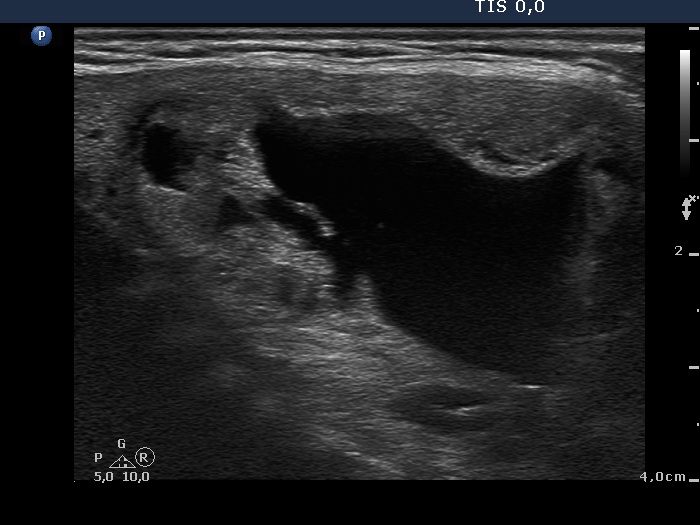Isthmus, longitudinal view. There are several smaller cystic areas within the lesion. On this image, the lesion seems to be a central-type cyst.