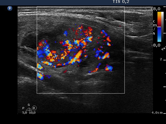 Right lobe, longitudinal view, color Doppler mode. Left the upper cystic, right the hypoechogenic nodule.