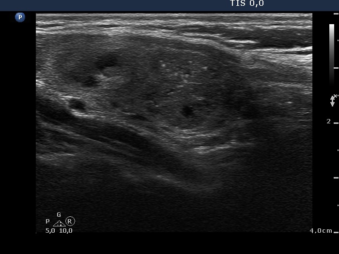 Lower part of the right lobe, longitudinal scan. The hypoechogenic nodule has a lobulated surface.