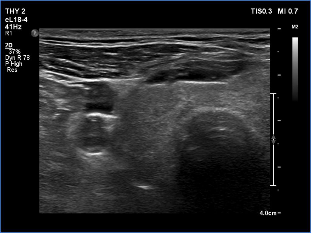 Ultrasonography. The right lobe was echonormal and intact. A large mass occupied almost the entire left lobe. On this side, normal thyroid tissue could only be identified in the dorsal part. The mass was composed of echonormal and hypoechoic areas, had macrocalcifications, irregular intranodular vascularity and proved to be very hard on elastography. There were multiple lymph nodes in III, IV and V left neck compartments. One of the nodes was in close proximity to the jugular vein and was suspicious of having broken into the vessel. The trachea was significantly narrowed at the lower level of the thyroid.