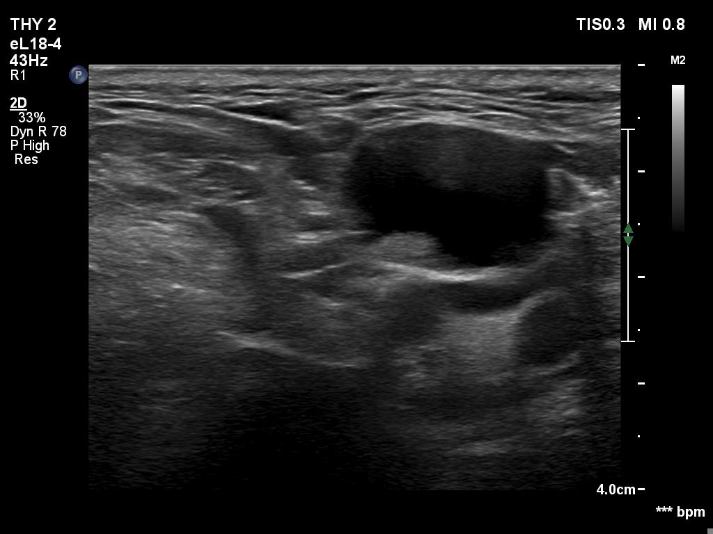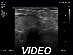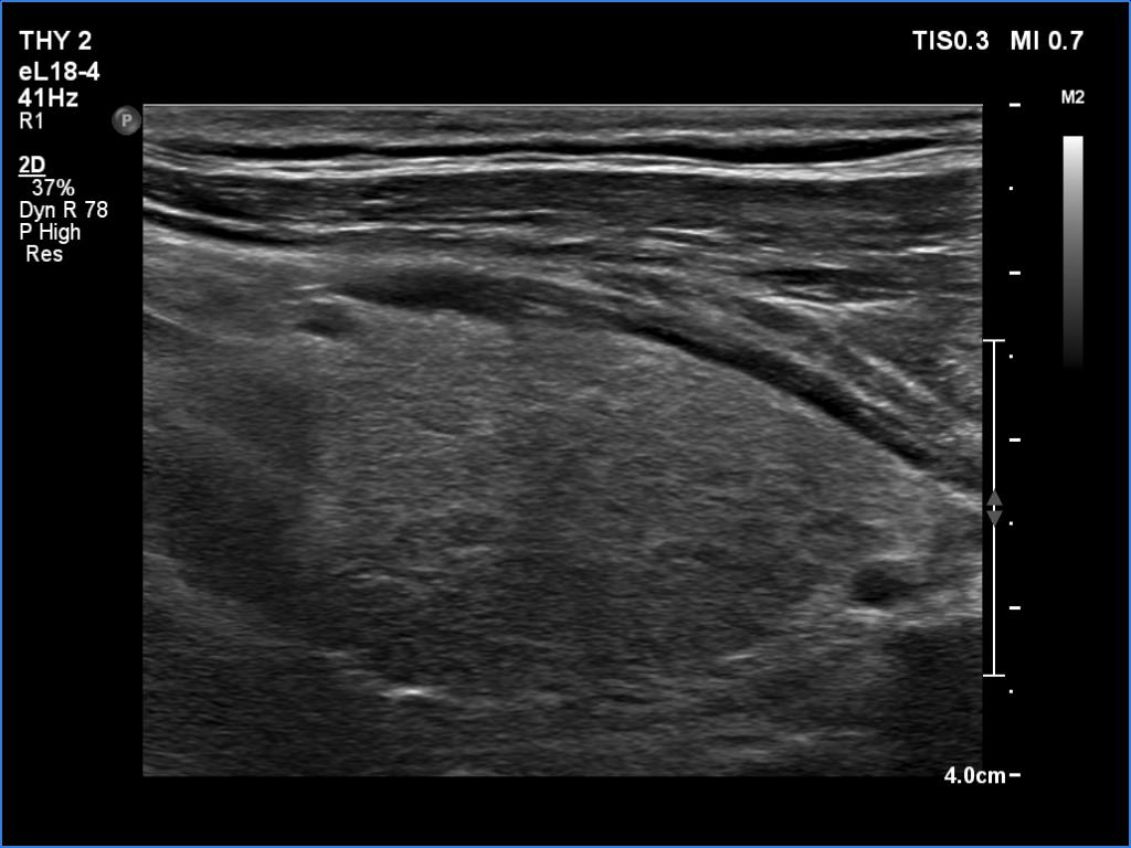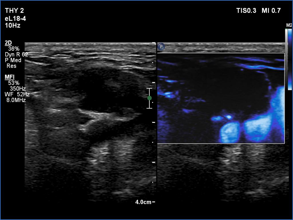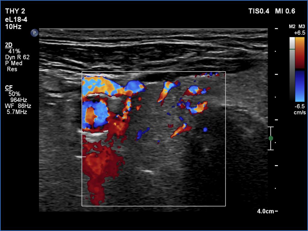 US-guided aspiration was performed from the thyroid mass and from the lymph node presented in the images. Cytology resulted in all three cases in metastatic carcinoma. Wash out thyroglobulin levels were 2.02 and 8.19 ng/L in the thyroid mass and in the neck lymph node, respectively.