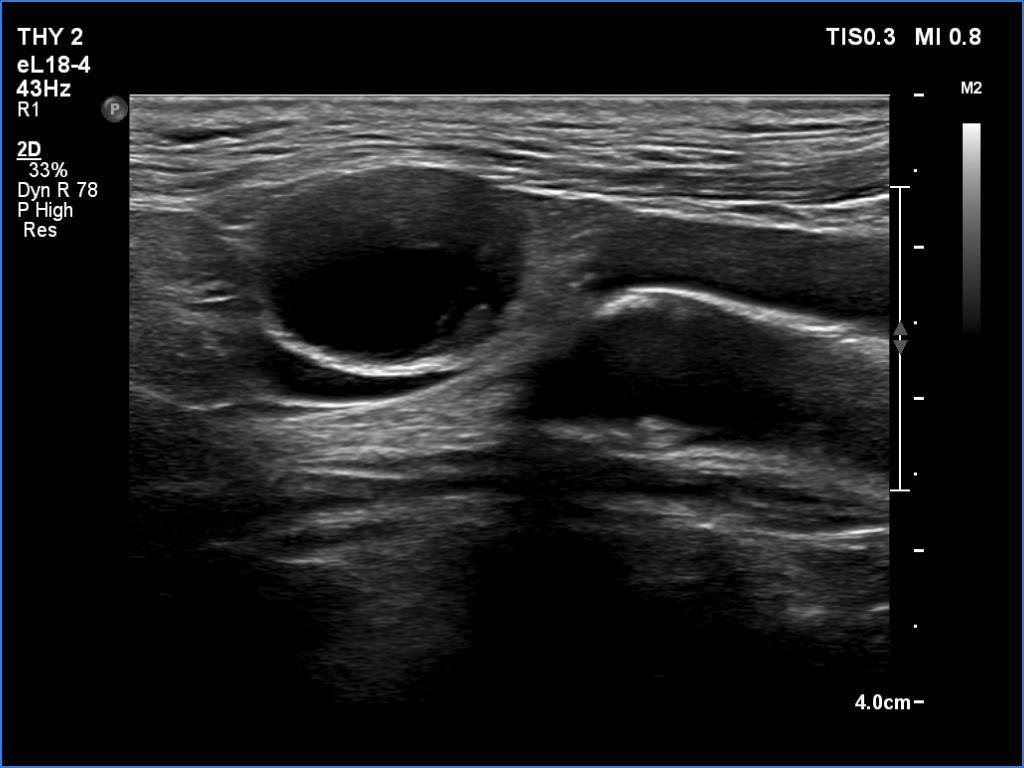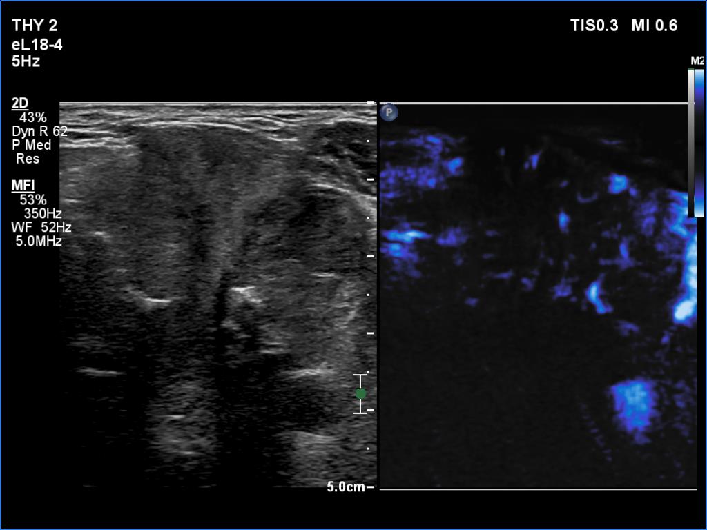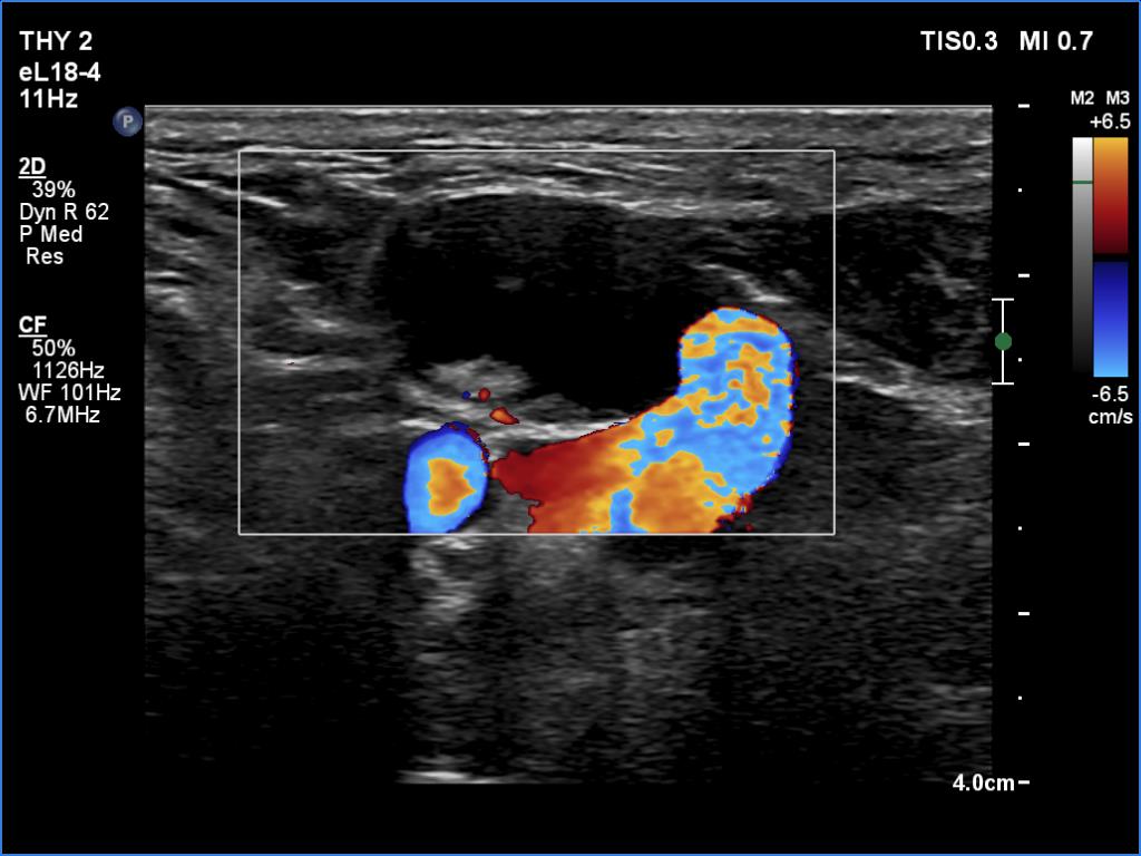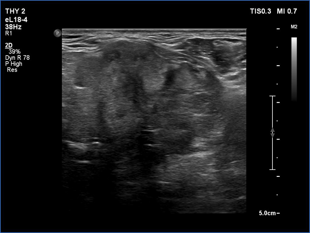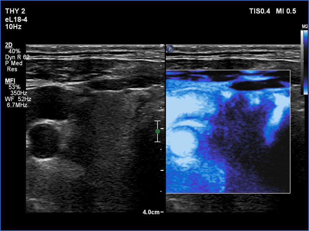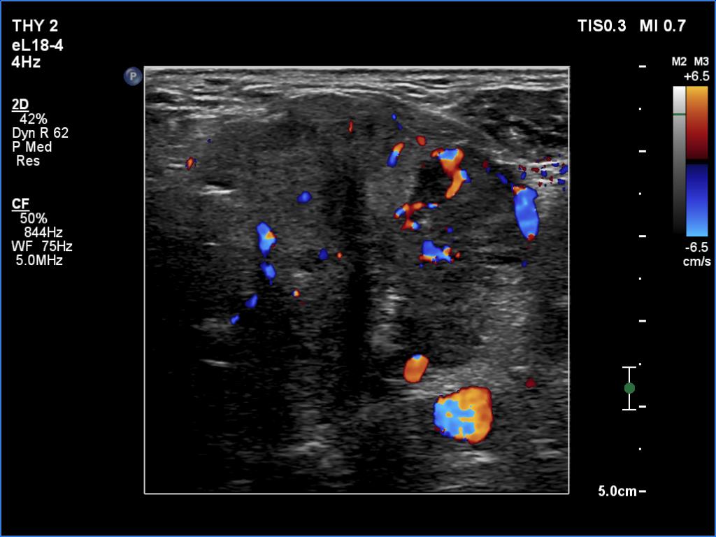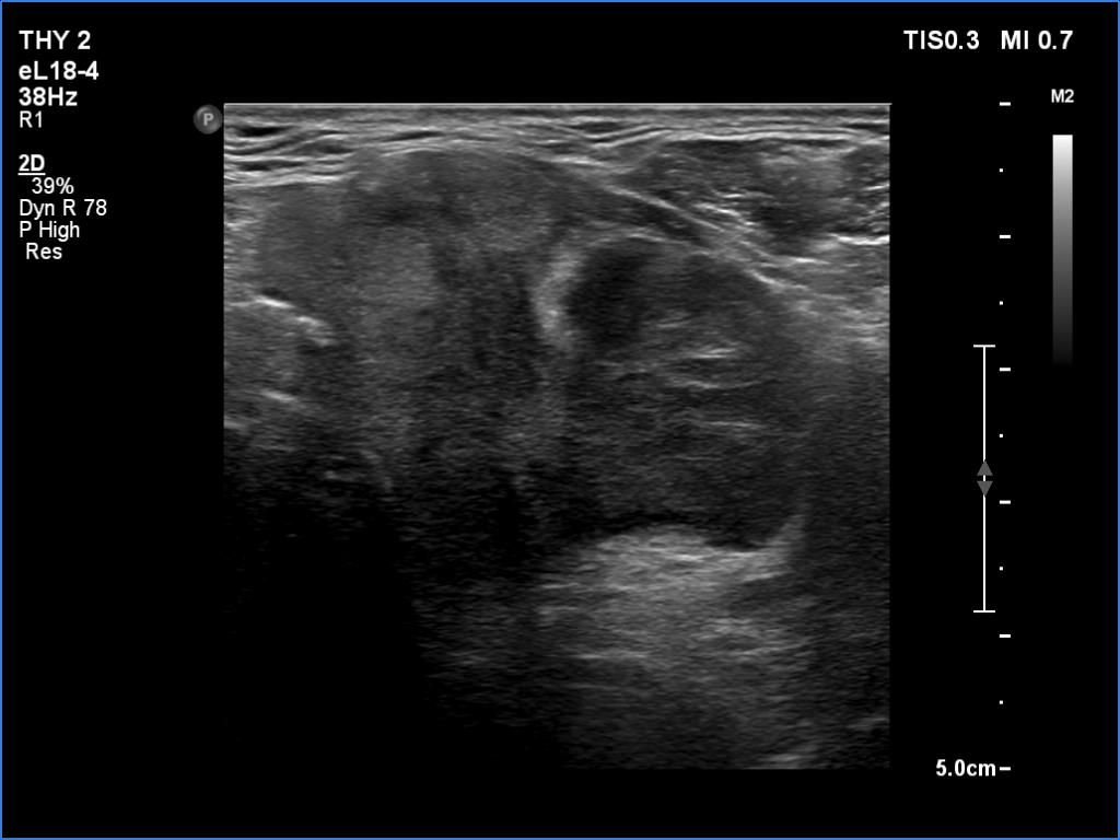 2. There are several remarkable findings in this case, e.g., the destruction of the left lobe by the tumor, the elastography pattern, the relation of the largest metastatic lymph node and the jugular vein, the ultrasound demonstration of the trachea' stricture.