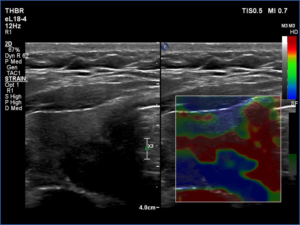 Ultrasonography. The thyroid was echonormal. The cyst has not refilled. There was a moderately hypoechoic nodule with signs of cystic degeneration in the left lobe. The nodule showed irregular, lobulated margins. I present two elastography images which demonstrate the usual finding in cytic lesions: there is a stratification of levels with different elasticity irrespectively of benign or malignant origine of cystic nodule.