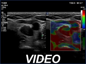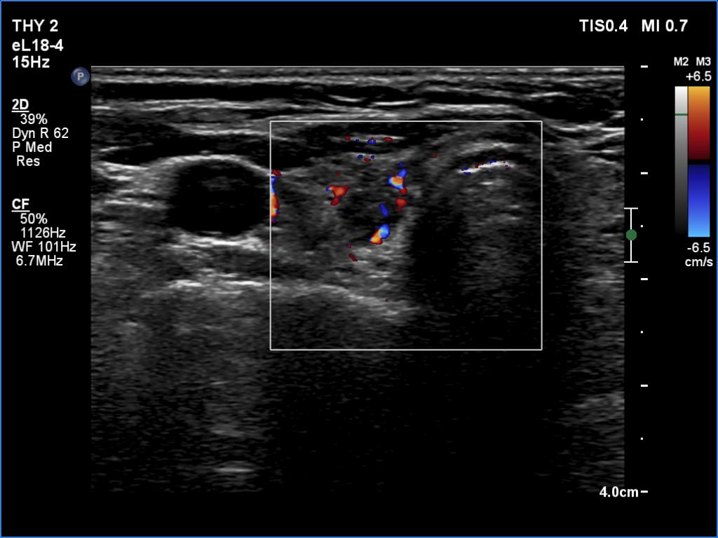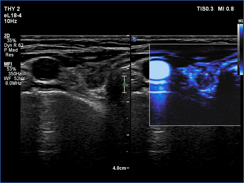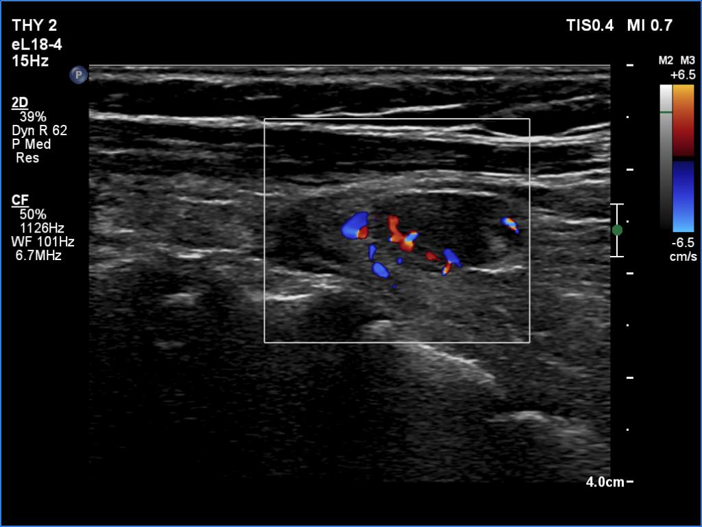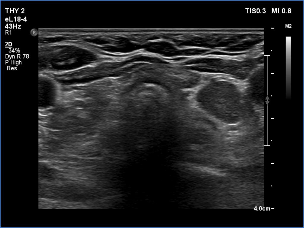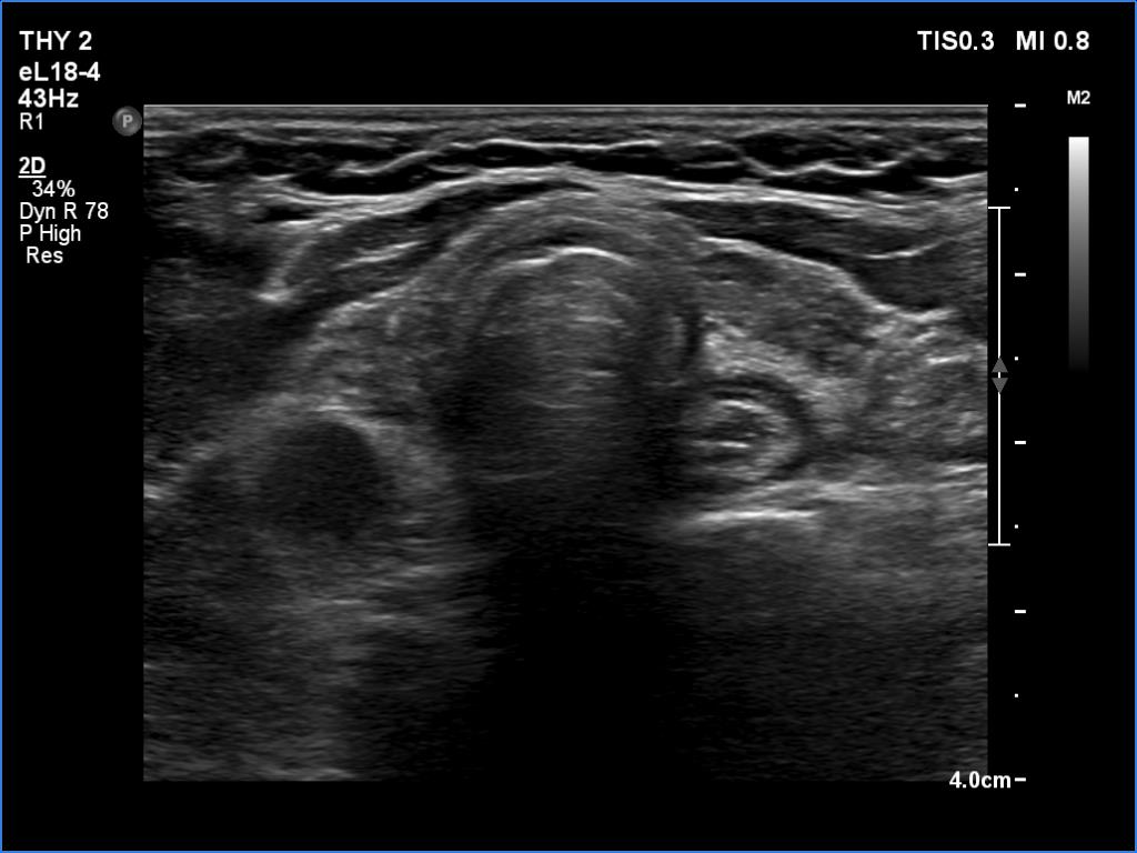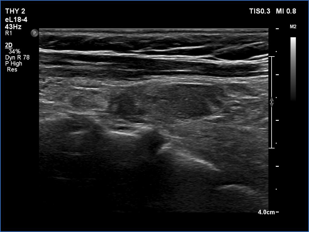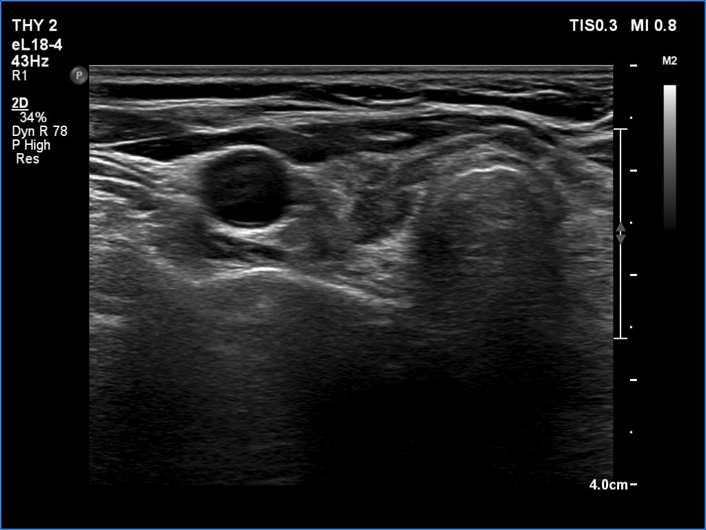 Ultrasonography. The thyroid was atrophic and hypoechoic. There was a hypoechoic mass under the lower pole of the left lobe.