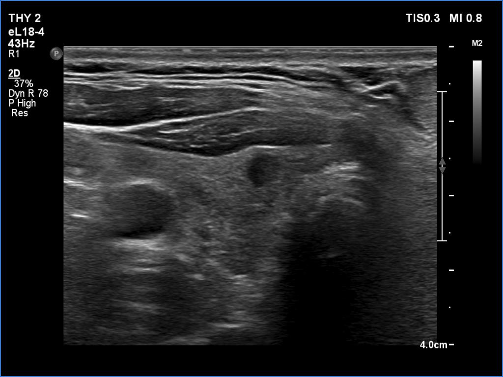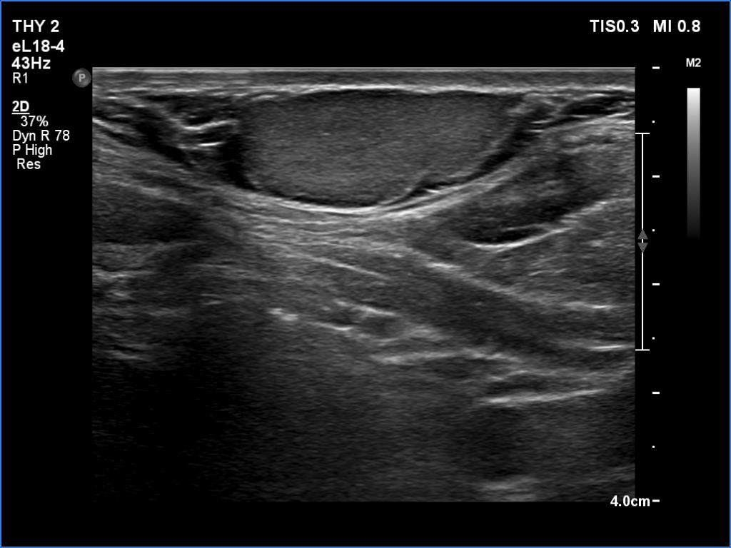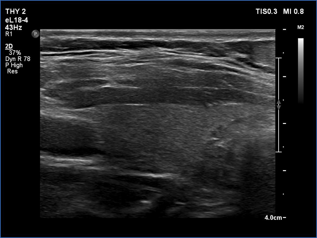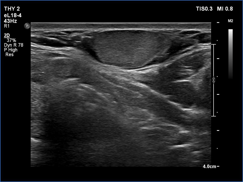 Ultrasonography. The thyroid was echonormal and had several small cystic lesions without any clinical or oncological importance. According to the palpable mass, a moderately hypoechoic lesion was detected several centimeters under the thyroid in the middle of the neck. The lesion was within the muscle tissue. It was homogeneous and presented no vascularity.