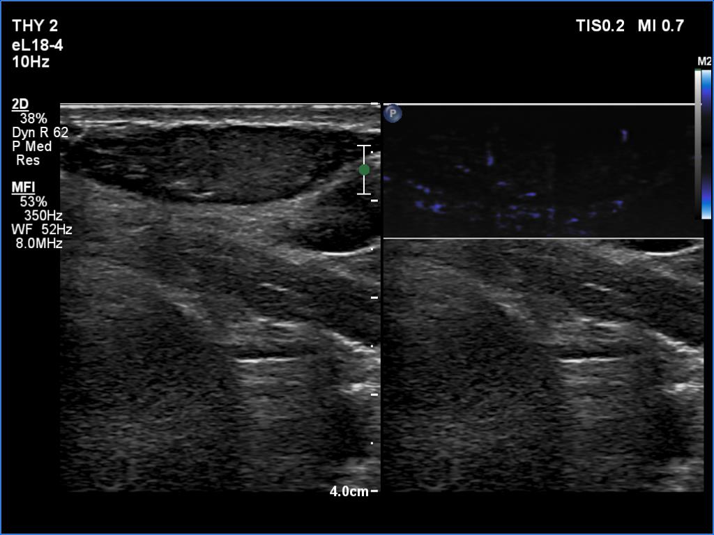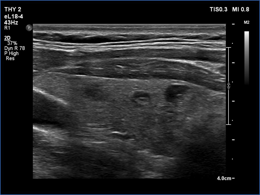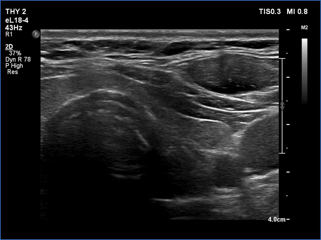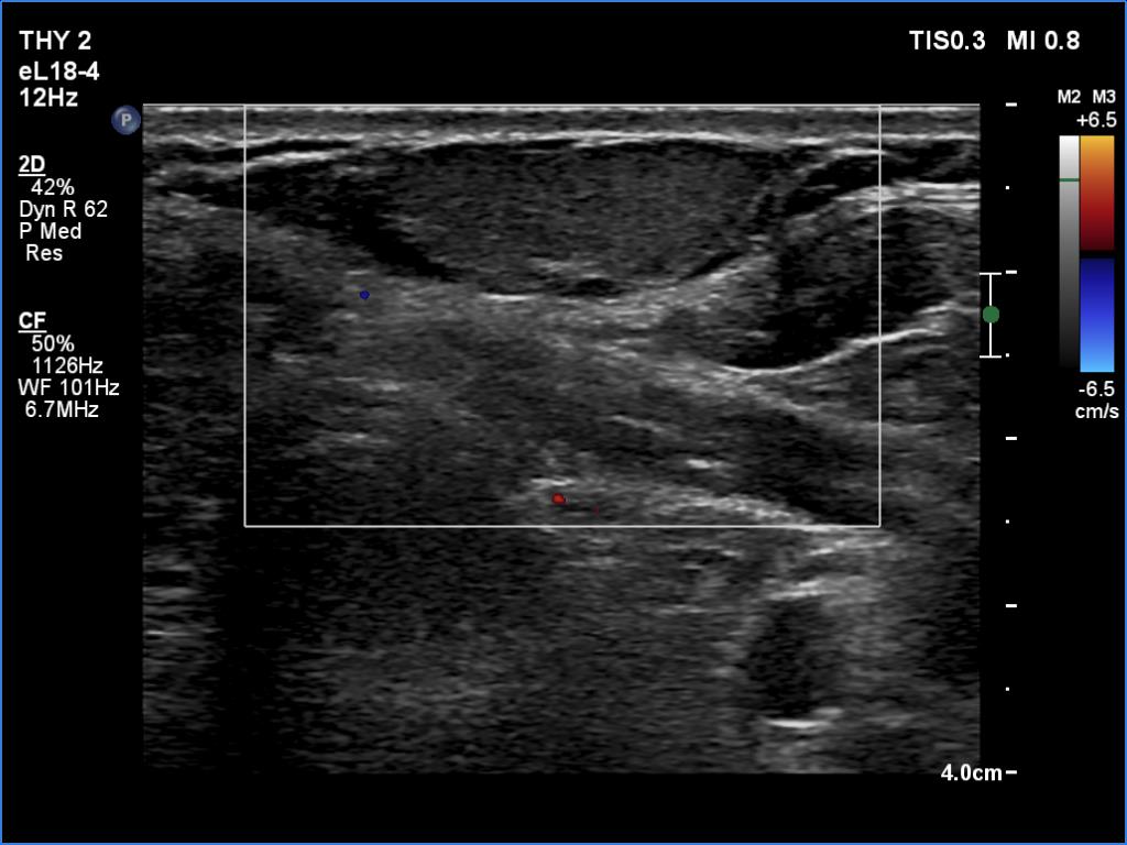Ultrasonography. The thyroid was echonormal and had several small cystic lesions without any clinical or oncological importance. According to the palpable mass, a moderately hypoechoic lesion was detected several centimeters under the thyroid in the middle of the neck. The lesion was within the muscle tissue. It was homogeneous and presented no vascularity.