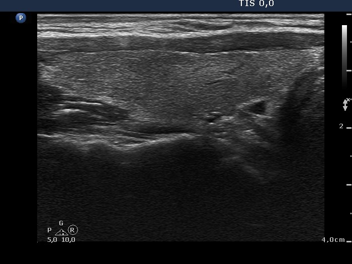 Right lobe, longitudinal scan. There are several minimally hypoechogenic areas, the presence of which raises the possibility of lymphocytic thyroiditis.
