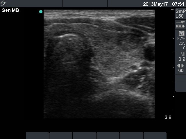 Left lobe, transverse scan. The lobe presents hypoechogenic areas and a larger nodule-like lesion in the ventrolateral part of the lobe. The latter presents microcalcification.