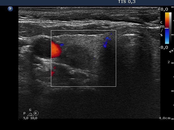 Right lobe, transverse scan, color Doppler mode. The nodule displays no vascularization.