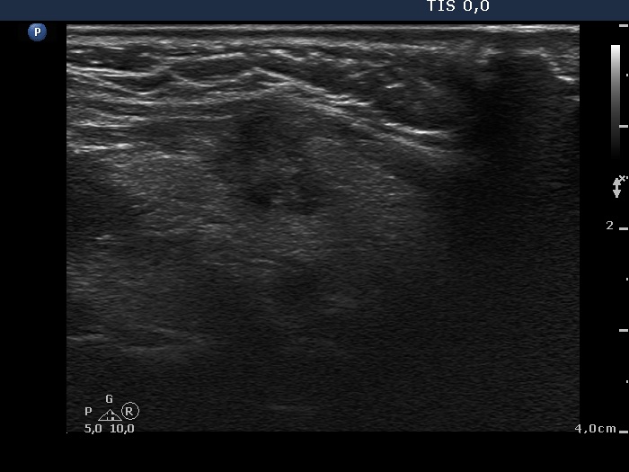 Left lobe, another longitudinal scan. This pattern is highly suspicious of an extrathyroidal invasion.