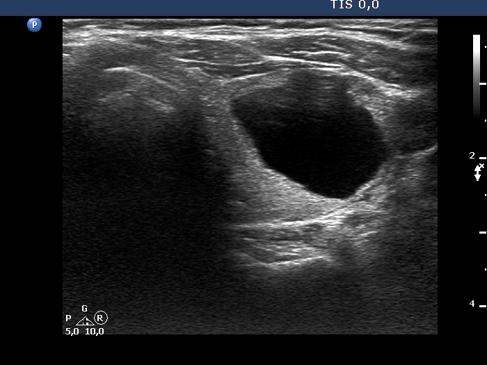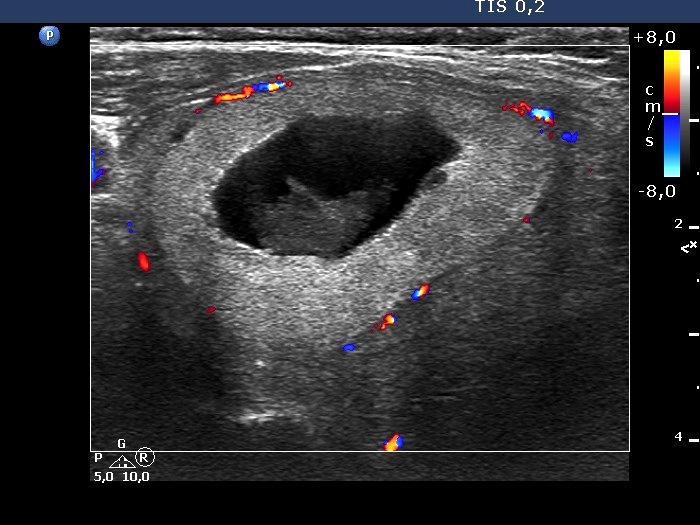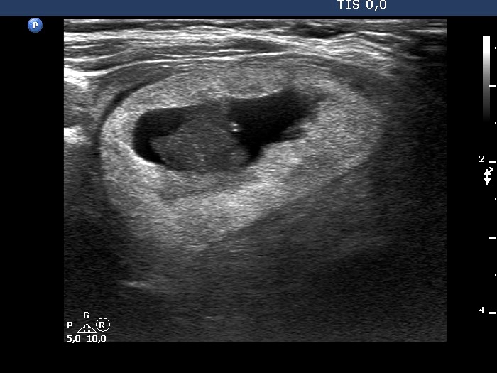 The nodule has tiny hypoechoic areas, therefore the lesion can be regarded as an EU-TIRADS 4 lesion. Nevertheless, the hypoechoic areas do not raise the possibility that they would represent another pathological entity, therefore, is seems to be more accurate to classify the nodule as an EU-TIRADS 3 lesion.