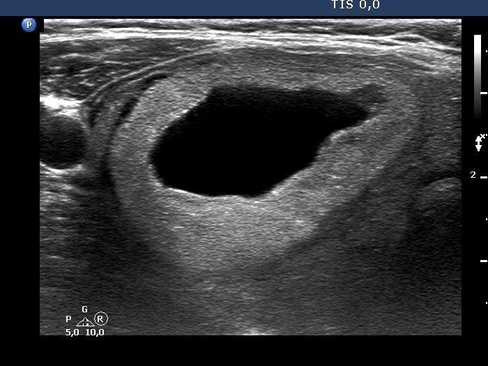 Ultrasonography. The right cystic nodule has in part refilled. Otherwise, the presentation remained unchanged.Suggestion: TSH determination in 6 months, ultrasound in 3 to 5 years.