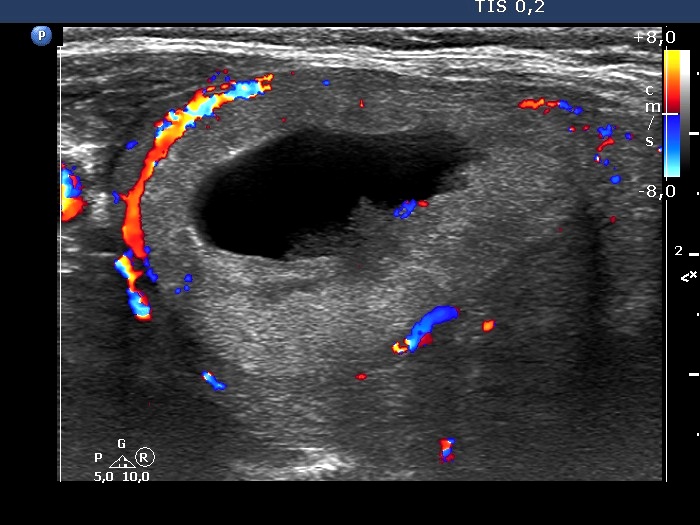 Ultrasonography. The thyroid was moderately hypoechogenic. There were two central-type cysts, one in the left lobe and another one in the right lobe. Both had perinodular vascularization.4 mL serous fluid was aspirated. Aspiration cytology resulted in benign cystic lesion.