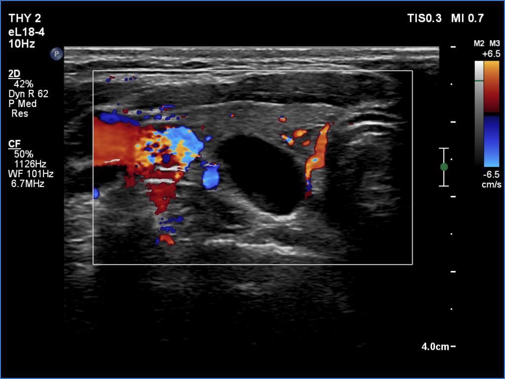 4. The cystic lesion can be regarded as EU-TIRADS 2 or EU-TIRADS 3 nodule, depending on the judgement of the uncertain structure at the cystic wall. Nor can it be ruled out to classify the lesion as EU-TIRADS 5 due to the nonparallel orientation. However, it is more rational and in the best interest of the patient to classify the lesion as EU-TIRADS 2.