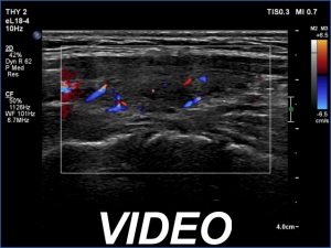 Ultrasonography. The thyroid was echonormal. There were several small hypoechoic areas in both lobes and a cystic nodule in the right lobe. At first sight the nodule seemed to be a pure cyst. However, thorough analysis revealed a tiny echonormal solid area in the dorsal part of the lesion. Therefore, this nodule does not meet the criteria of a pure cyst. The lesion presented taller-than-wide shape.