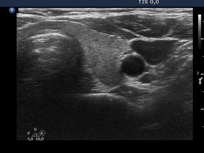 Clinical presentation: A 58-yr-old woman was referred for evaluation of a nodular goiter discovered on screening for 15 years. At the time of discovery, the largest diameter of the nodule was 10 mm.