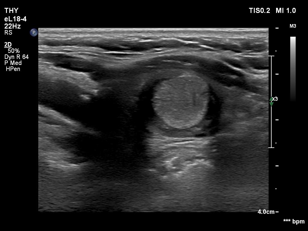 Ultrasonography. The thyroid was minimally hypoechoic. The right lobe has several cystic areas, none of them corresponded to true nodules, these were dilated macrofollicles. There was a dominantly solid nodule in the right lobe. If we compared the echogenicity to a healthy thyroid, then the nodule should be regarded as echonormal, while if the reference tissue was the extranodular part of the lobe, then the nodule should be classified as hyperechoic. The nodule had bright echogenic granule. After a thorough analysis, the most likely explanation was that this was either a back wall figure or comet tail artifact. Nevertheless, microcalcification could not be fully excluded.