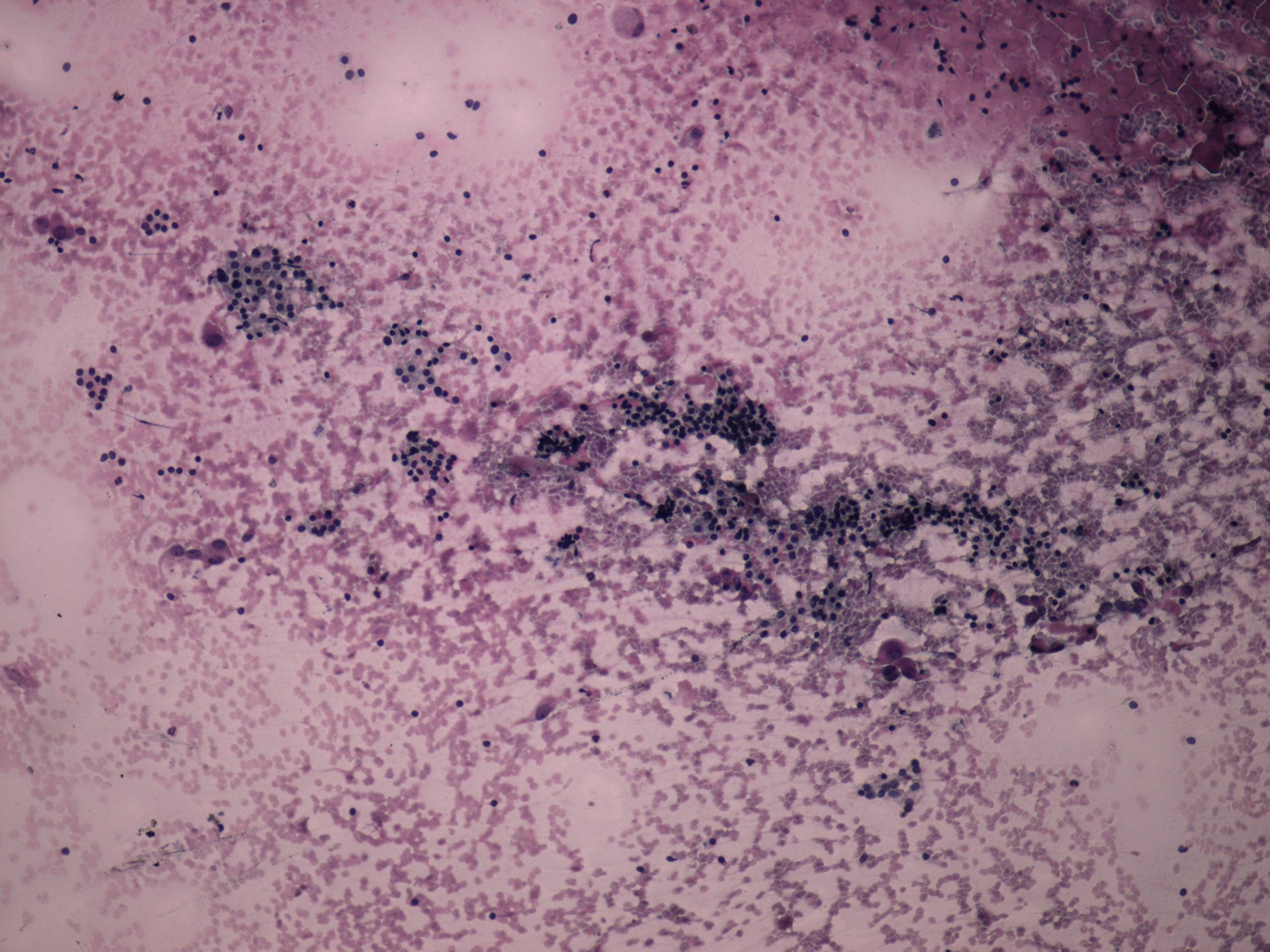 Pap-smear, 100x. There is diffuse colloid precipitate in the background. Follicular cells are found dissociated and in micro- and normofollicles.