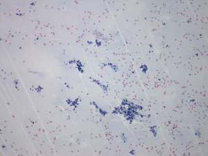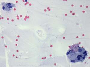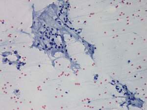Cytological diagnosis: subacute, granulomatous de Quervain's thyroiditis.