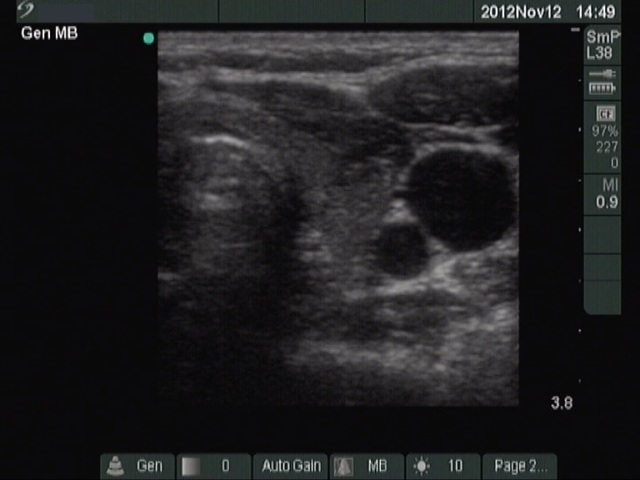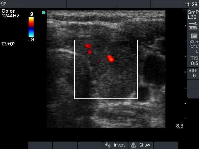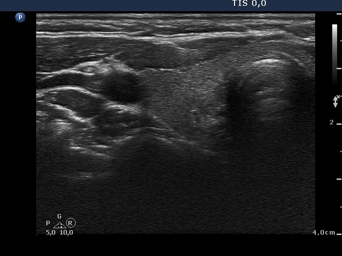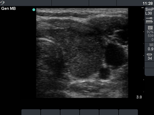 Ultrasonography: The thyroid was hypoechogenic and inhomogeneous. The vascularization was average.