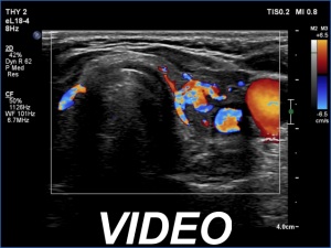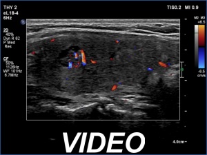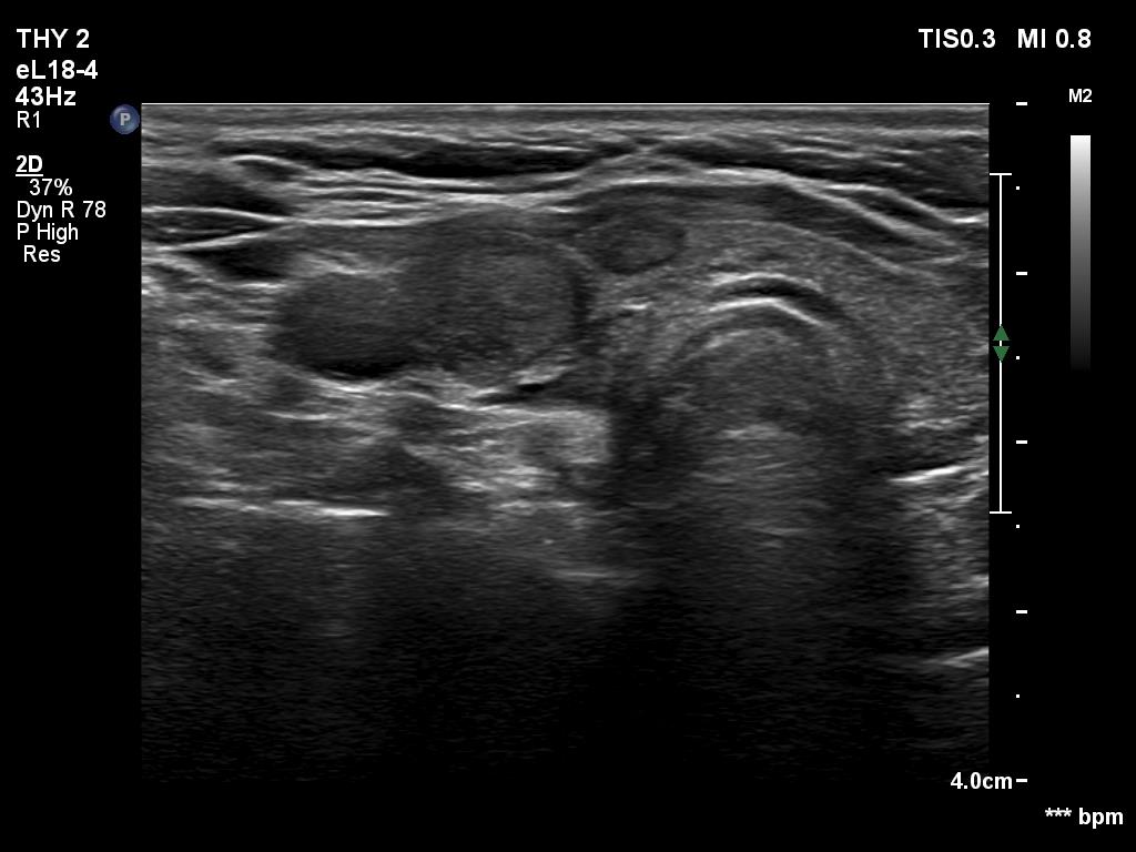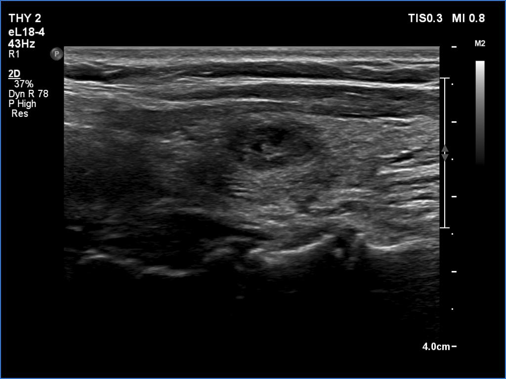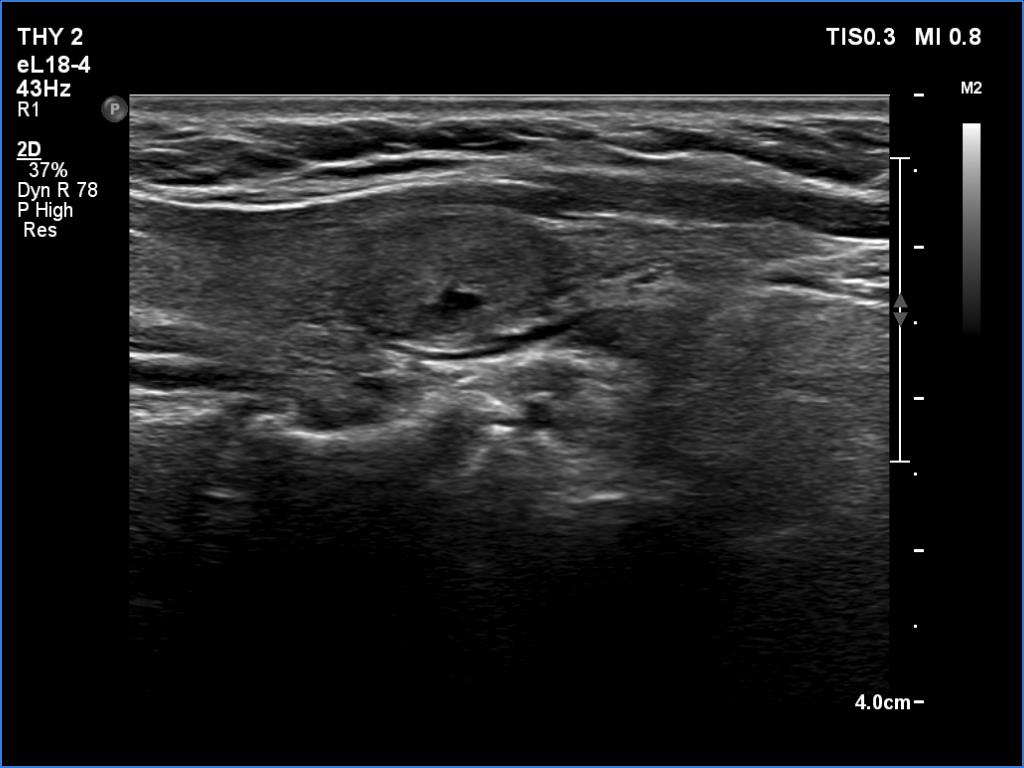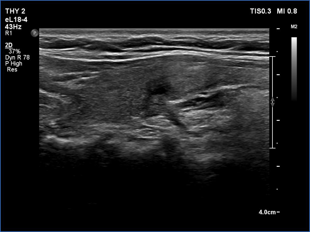 Ultrasonography: The ultrasound pattern has normalized. There was a moderately hypoechoic nodule in the right lobe while a cystic lesion in the left one.
