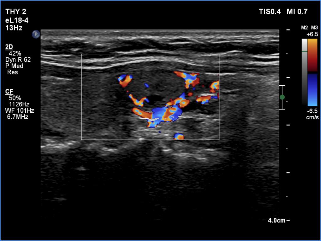 Cytology of the right nodule resulted in benign colloid goiter.