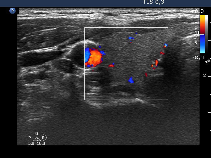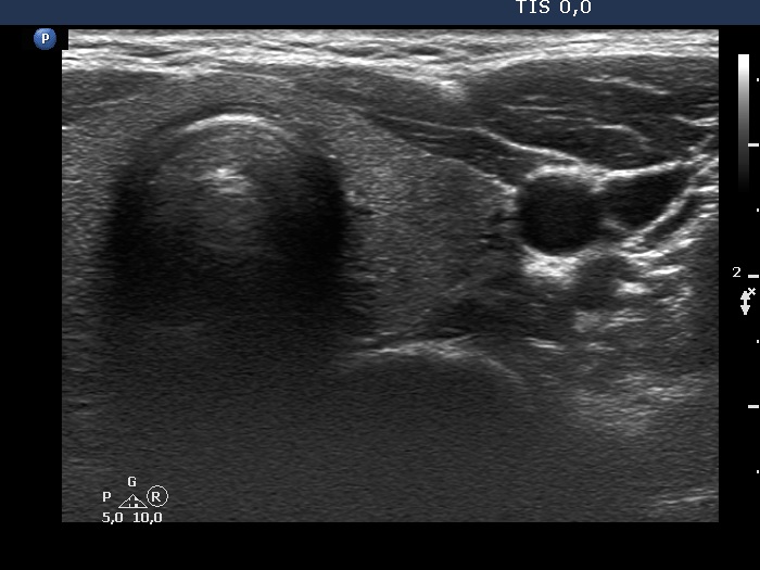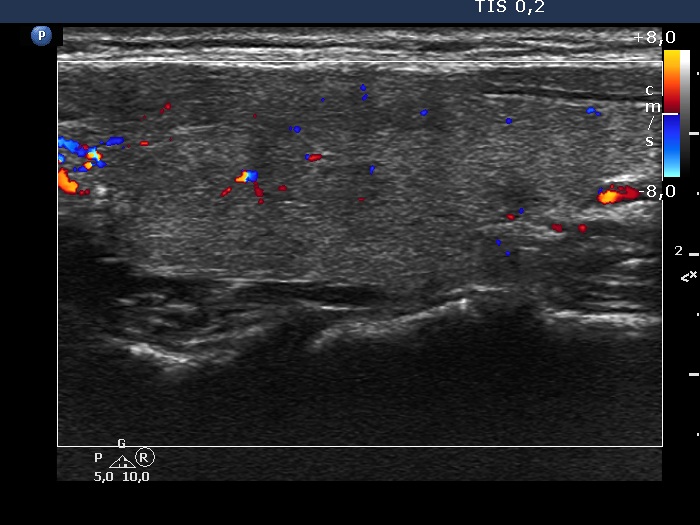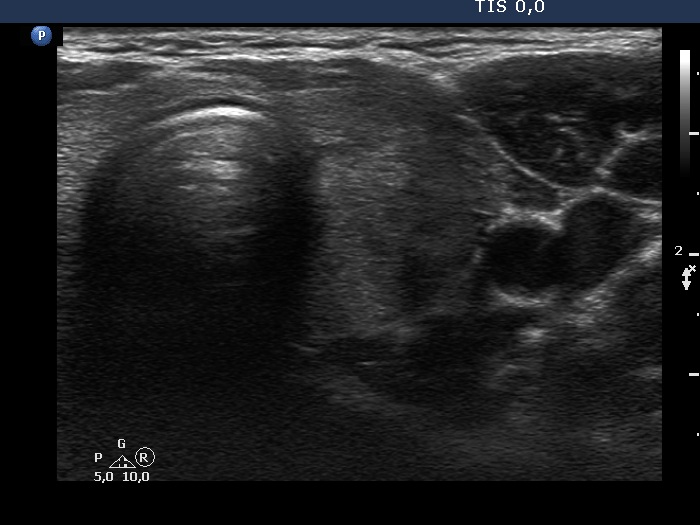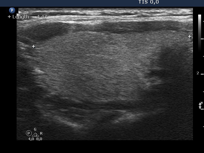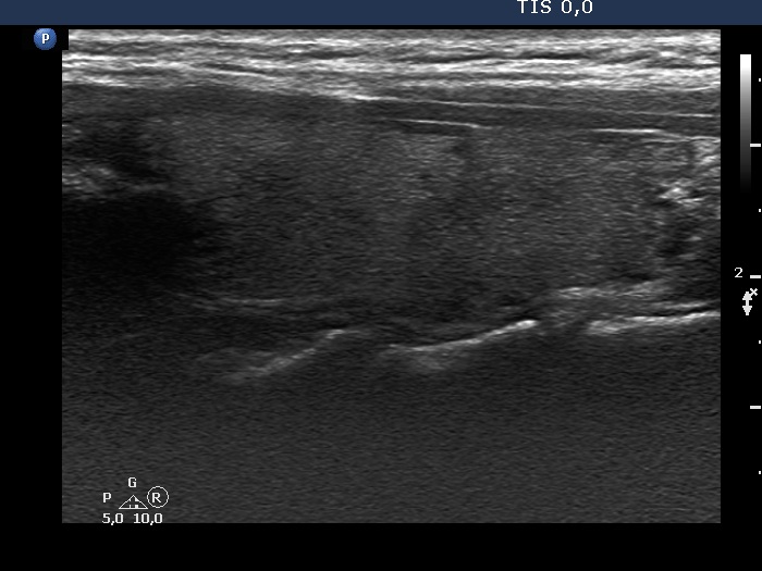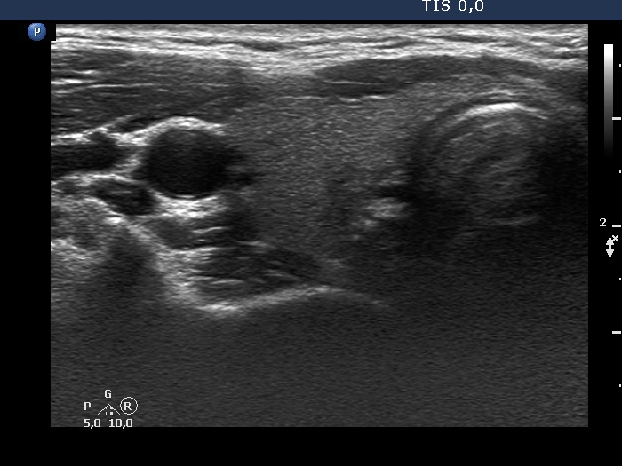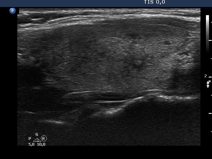 Ultrasonography: The thyroid was echonormal and intact.